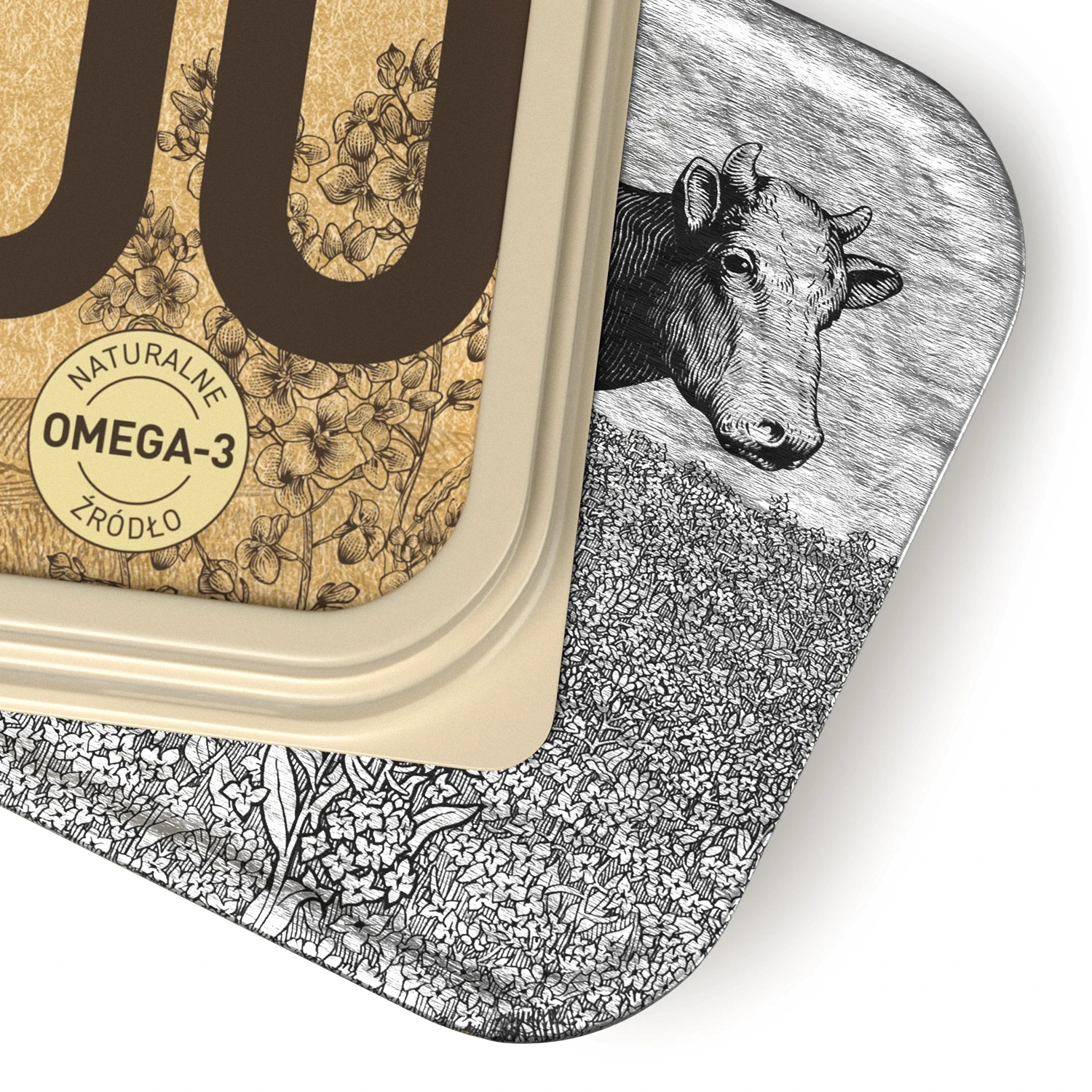 The packaging design conveys the purity of natural ingredients. The visual combines clean aesthetics with a sophisticated engraving of a Holstein-Friesian dairy cow.