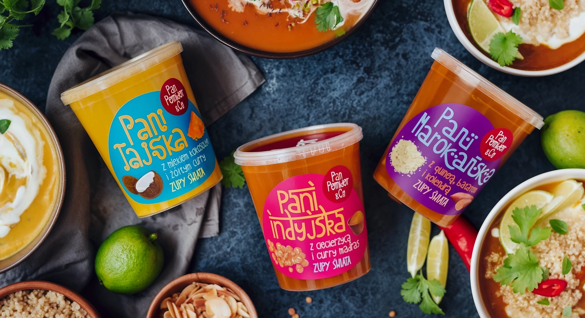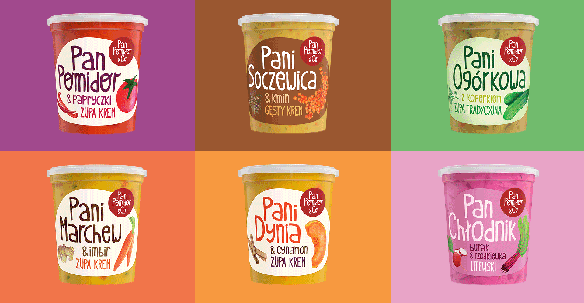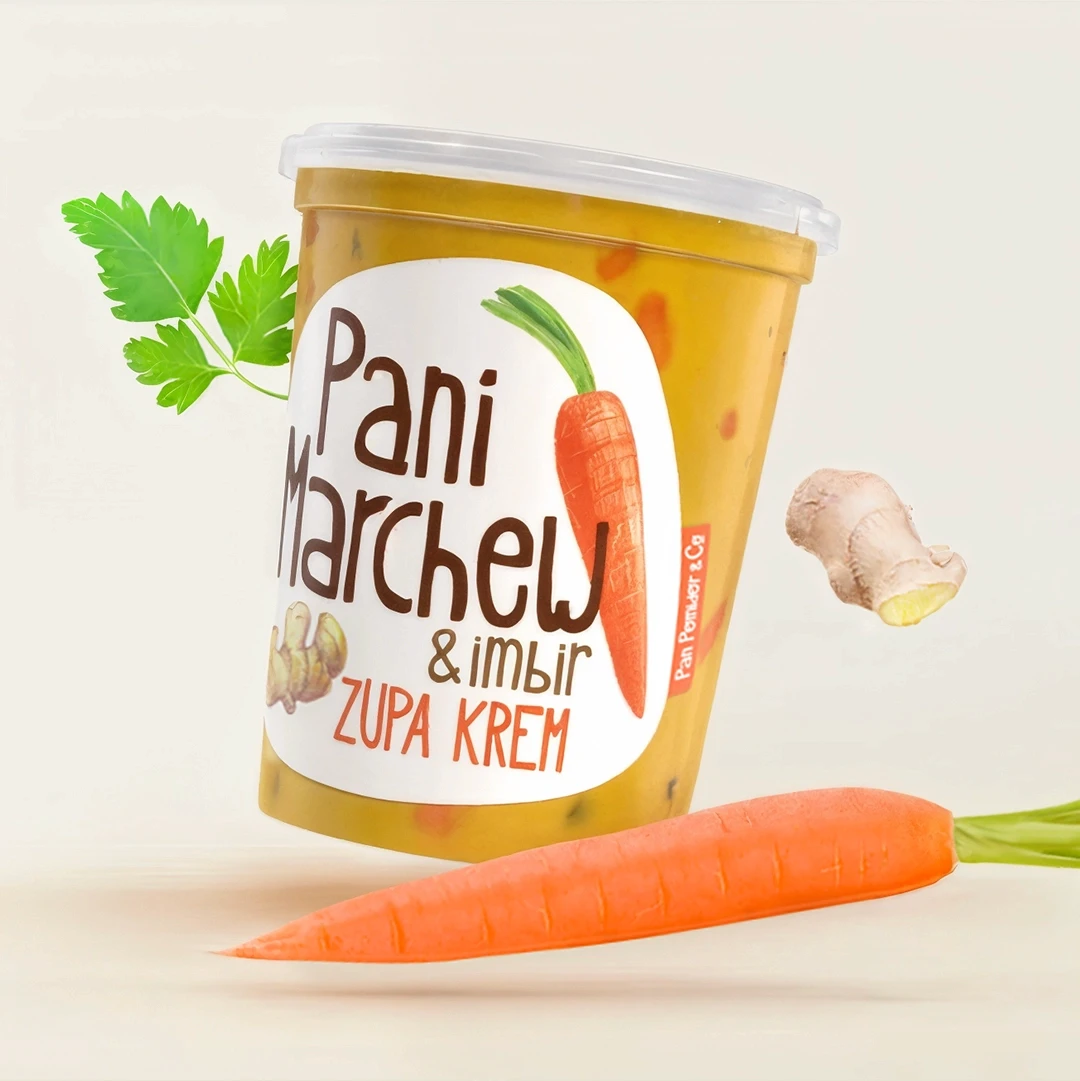 Hand-drawn illustrations highlight the freshness of the soups, the absence of artificial additives, and the playful nature of Pan Pomidor soup. Planned imperfections, like organic vegetable imperfections, indicate that everything is pure, honest, and wholesome.
